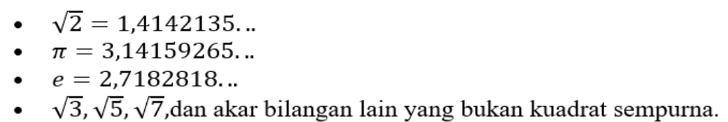 - Bentuk desimalnya tidak berhenti dan tidak berulang.